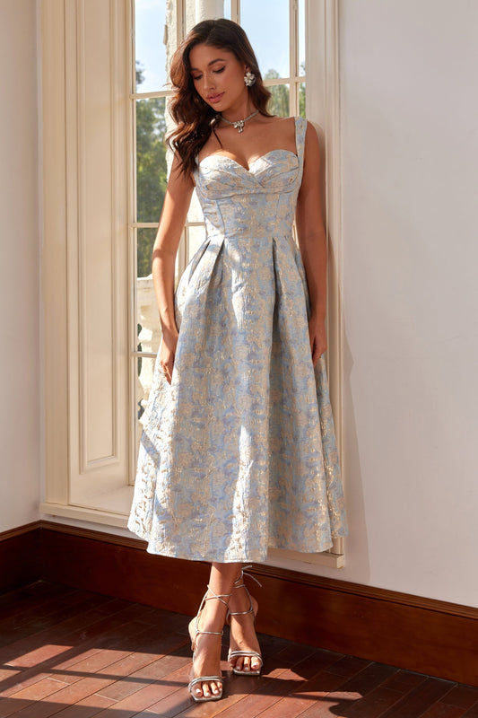 Sarah Mavi Jakarlı A Kesim Midi Elbise