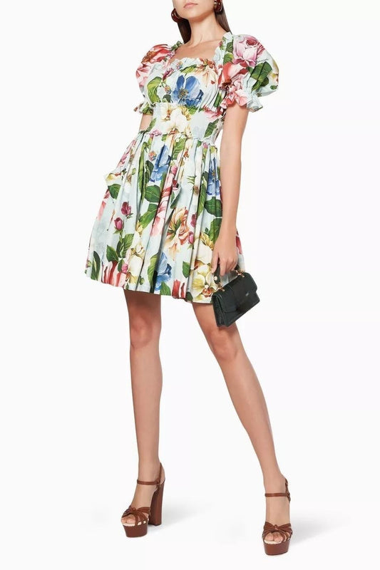 Sarmaşık Baskılı Büzgülü Korsajlı Geniş Mini Elbise