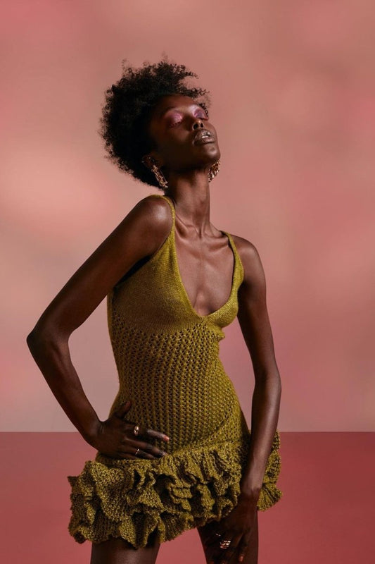 32% İndirimSara V Yaka Fırfırlı Etek Örgü Mini Elbise