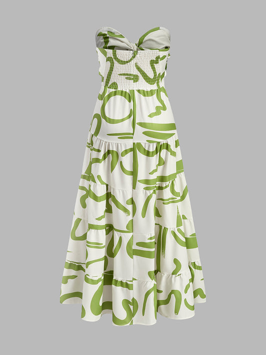 Una Baskılı Dekolteli Sırtı Açık Midi Elbise