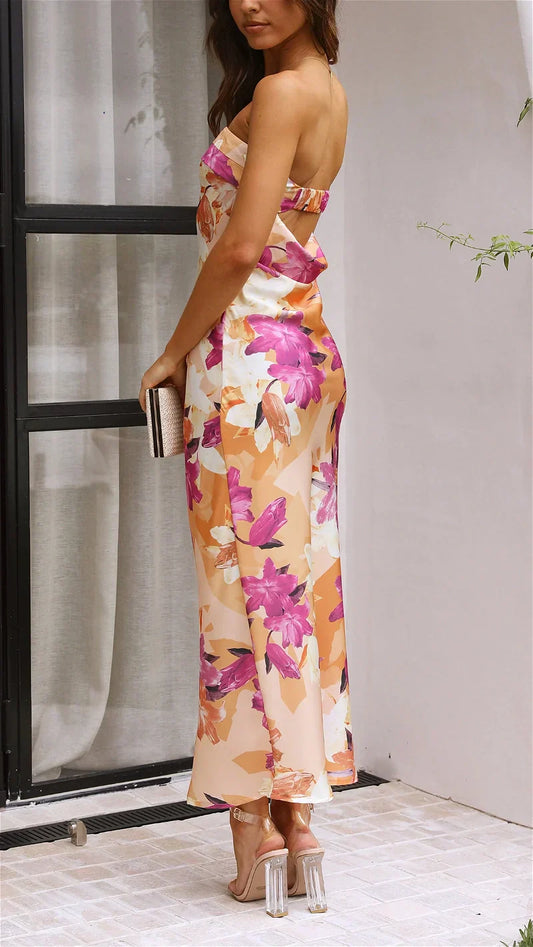 50% İndirimÇiçekli Sırt Dekolteli Maksi Elbise
