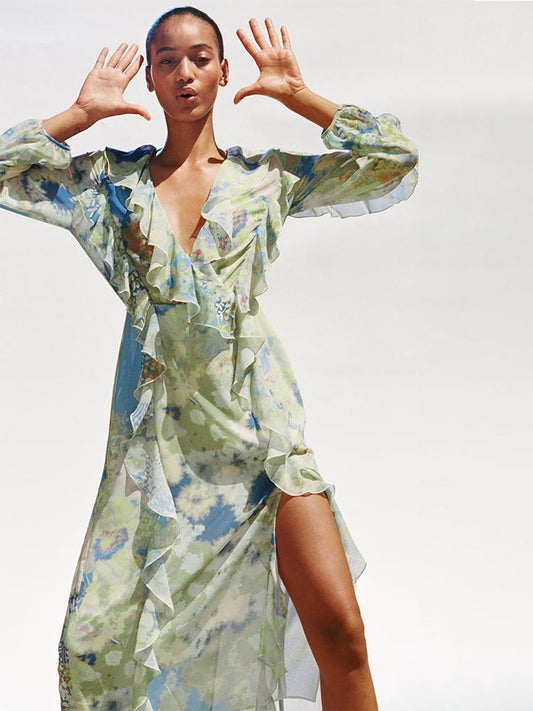 29% İndirimCleo Baskılı V Yaka Fırfırlı Şifon Maxi Elbise