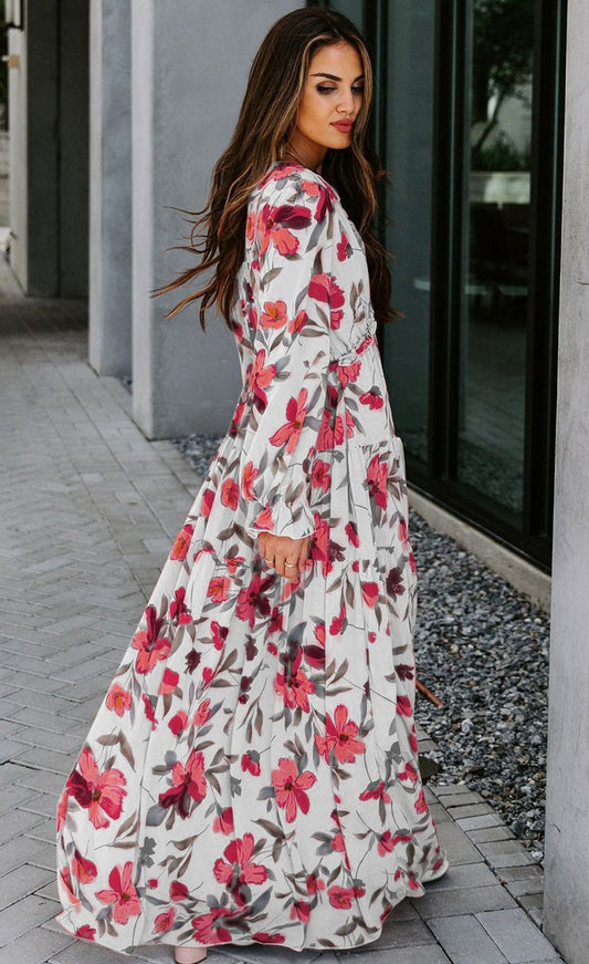 29% İndirimDale Baskılı V Yaka Katlı Maxi Elbise