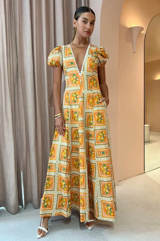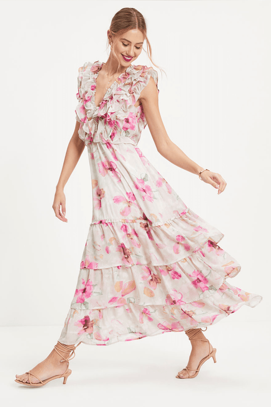 Doreen Baskılı Fırfırlı V Yaka Katlı Maxi Elbise