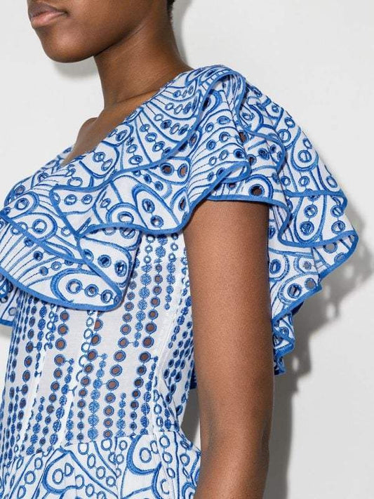 Dolly İşlemeli Dantel Düşük Omuz A Kesim Flare Midi Elbise