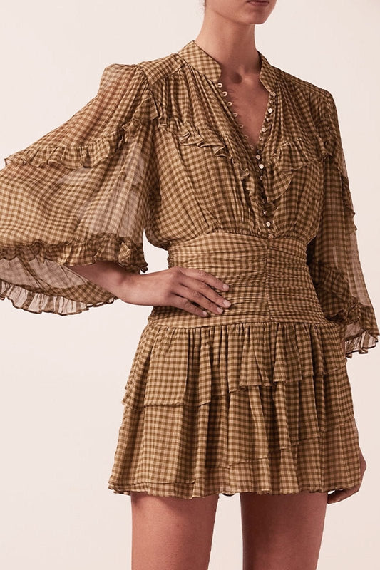Eliza Ekose Baskılı Fırfırlı Büzgülü Şifon Mini Elbise