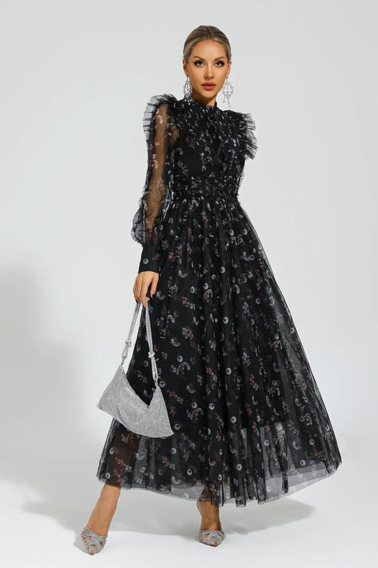 22% İndirimElara Siyah Çiçekli Uzun Kol Uzun Elbise