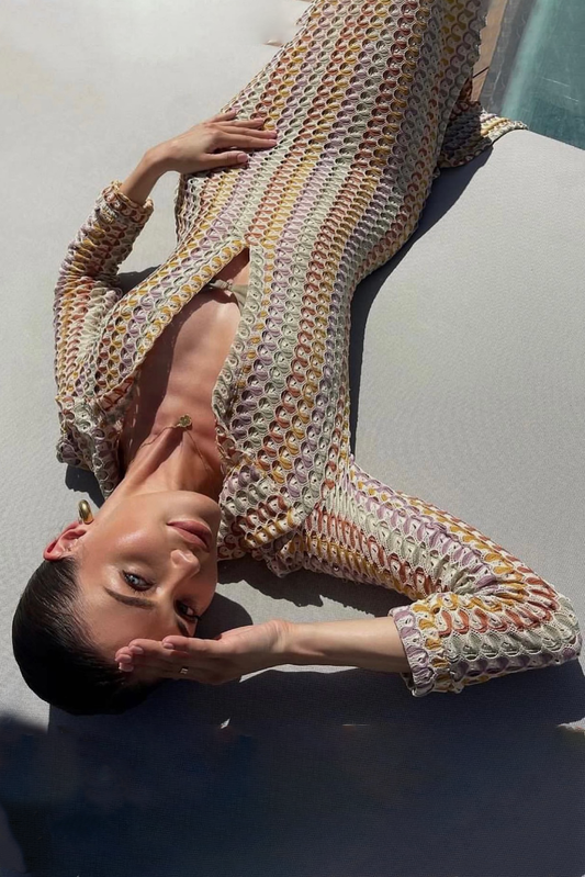 Eve Boyundan Bağlamalı Deniz Kenarı Detaylı Maxi File Elbise