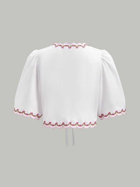 İşlemeli Taraklı Kenarlı Puf Kollu Fiyonklu Bluz