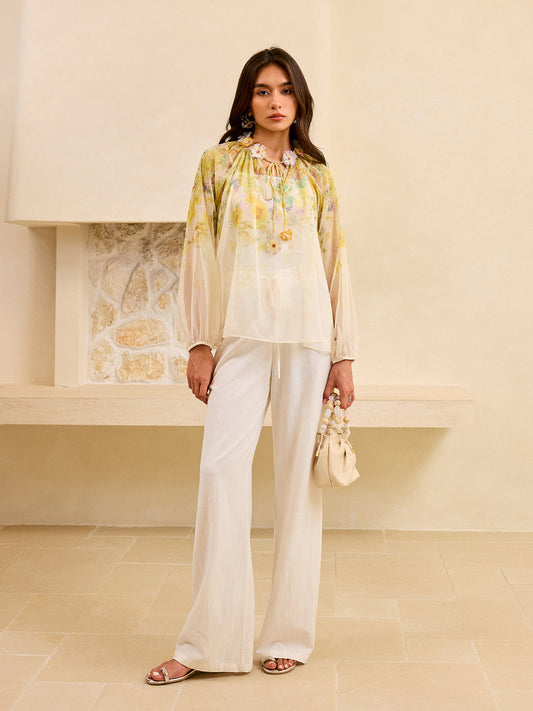 Yarı Şeffaf Şifon Çiçekli Drape Kol Bluz