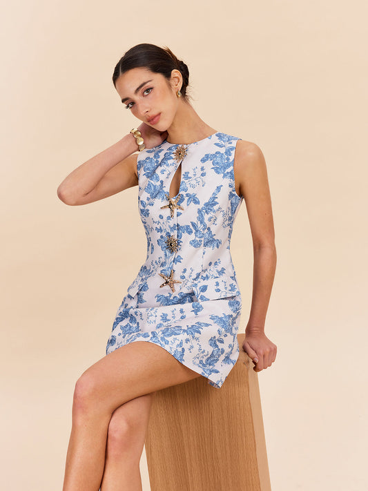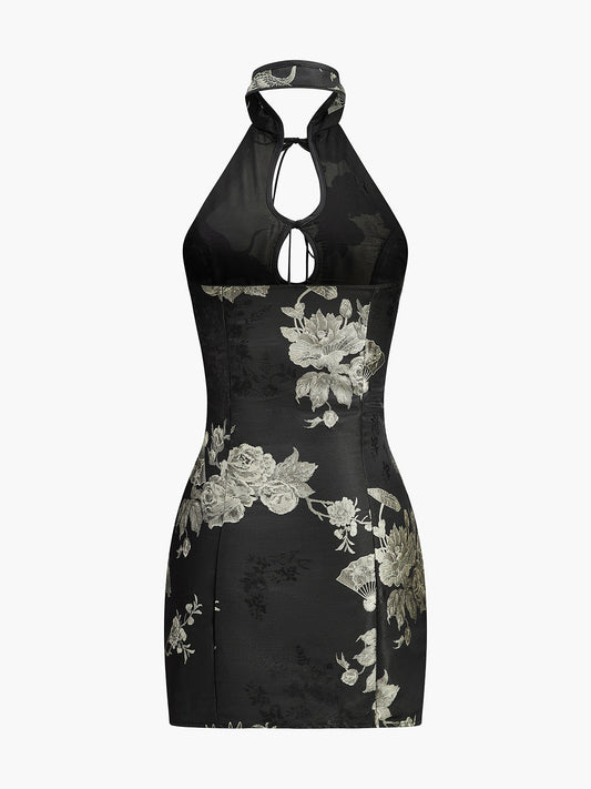 Çiçek Desenli Anahtar Deliği Detaylı Askılı Elbise