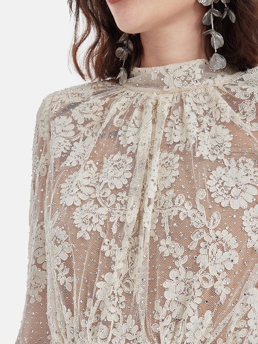 17% İndirimYarı Şeffaf Çiçekli Dantel Uzun Kollu Elbise