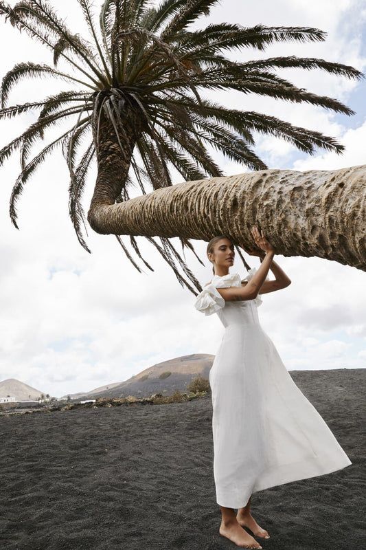 18% İndirimZolia Çiçek Omuzu Açık Keten Midi Elbise