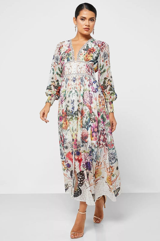 32% İndirimYvette Baskılı V Yaka Şifon Maxi Elbise