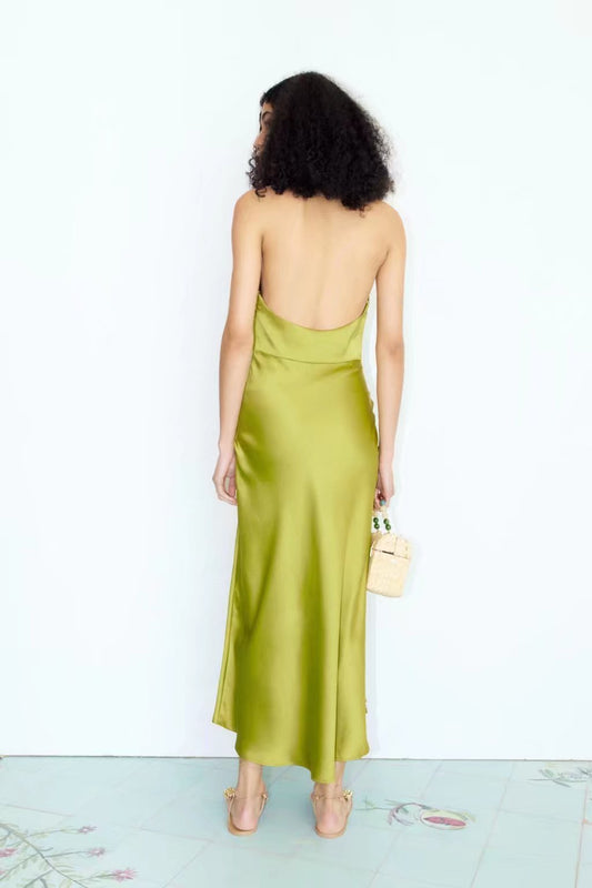 Vera Sırtı Açık Boyundan Bağlamalı Dokulu Saten Midi Elbise