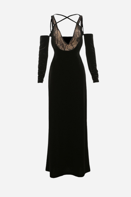 16% İndirimV Yaka Dantelli Kadife Eldiven Maxi Elbise