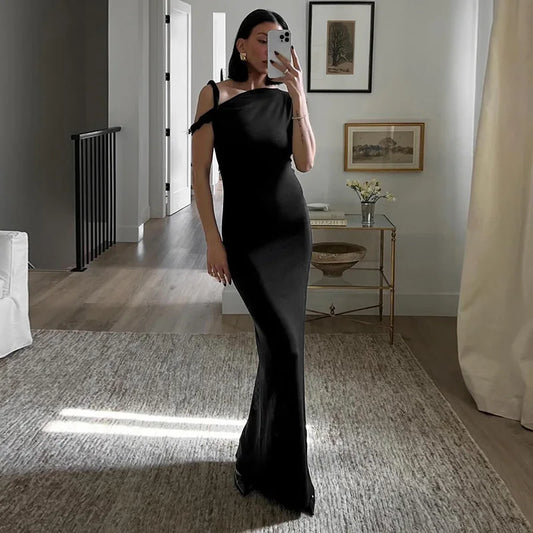 Taípe Tek Omuz Sırt Detay Uzun Saten Elbise