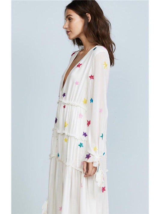 Pauline V Yaka İşlemeli Yıldız Bol Kesim Maxi Elbise