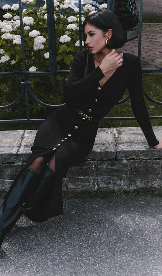 37% İndirimÖrme V Yaka Midi Elbise -Siyah