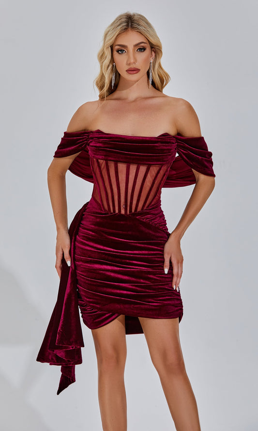 15% İndirimKırmızı Dahlia Sırtı Açık Taşlı File Mini Elbise