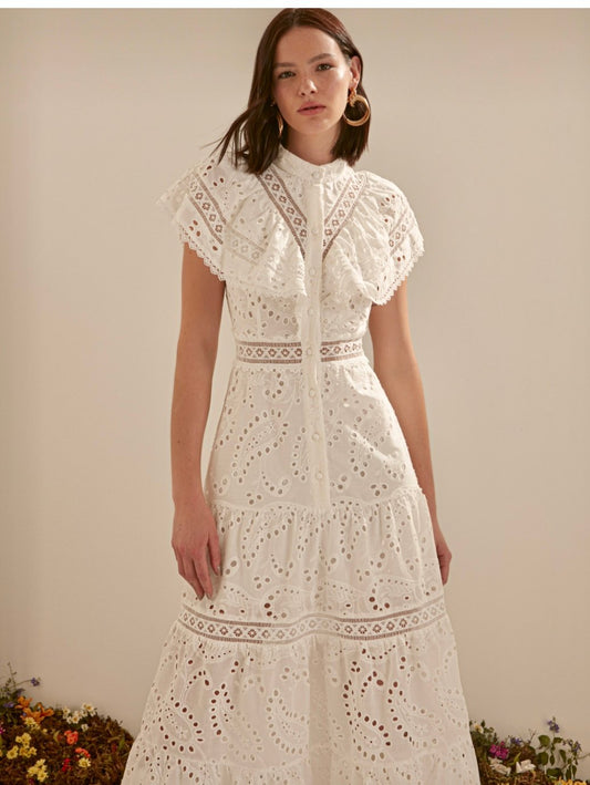 16% İndirimKit Nakışlı Dantel Fırfırlı Düğmeli Midi Elbise