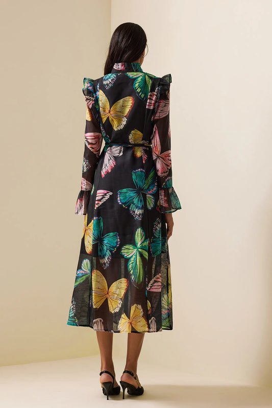 9% İndirimKelebek Desenli Fener Kol Midi Elbise