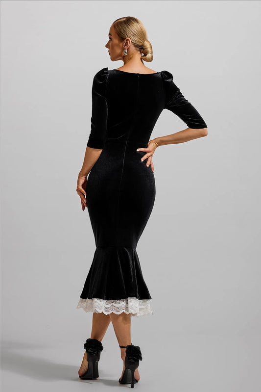 12% İndirimKatı Kadife Dantel Kalp Yaka Midi Elbise