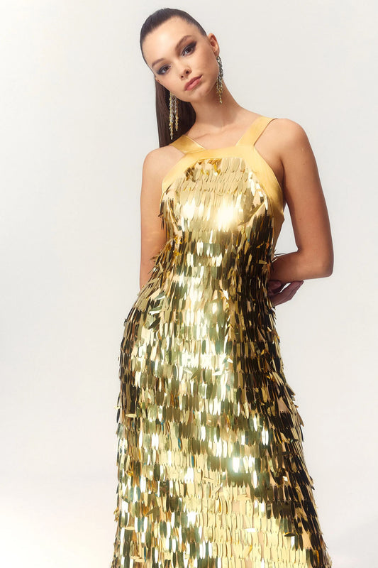 Geraldine Boyundan Bağlamalı Sırtı Açık Payet Maxi Elbise