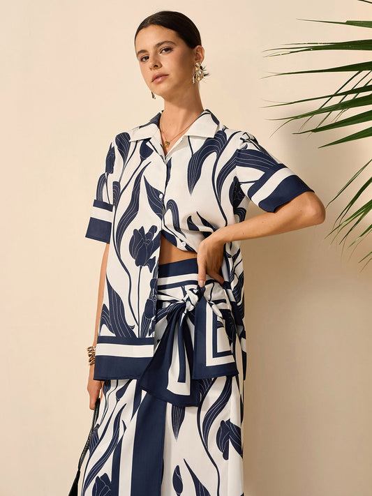 Düğmeli Yaka Su Desenli Gömlek Kemerli