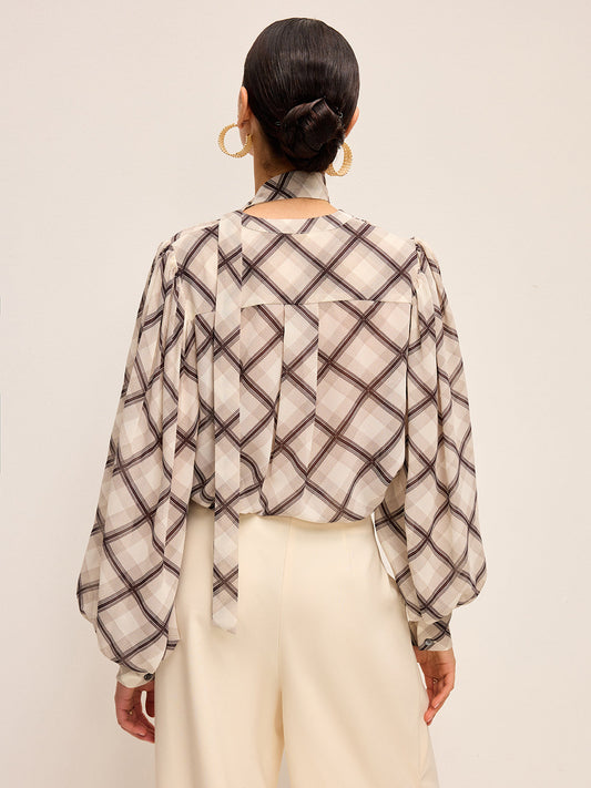 Boyun Bağlama Detaylı Uzun Kollu Ekose Şifon Gömlek