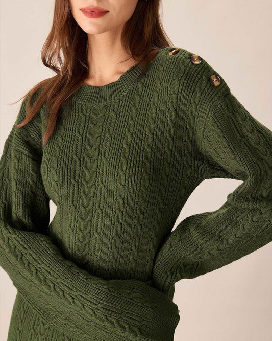 Yeşil Yuvarlak Yaka Bol Düğmeli Kazak