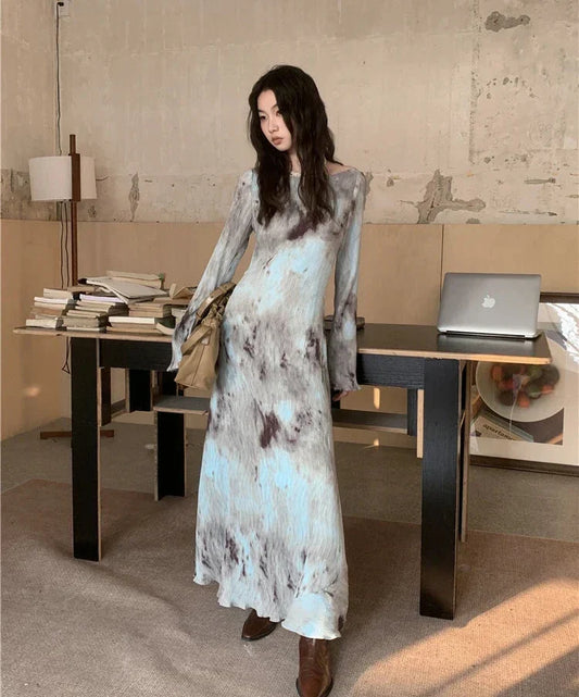 Cherr Mermer Desen Sırt Dekolte Uzun Kollu Maxi Elbise