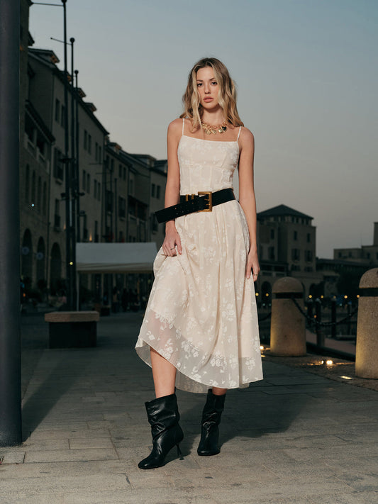 Yarı Şeffaf Çiçek Desenli Askılı Uzun Elbise