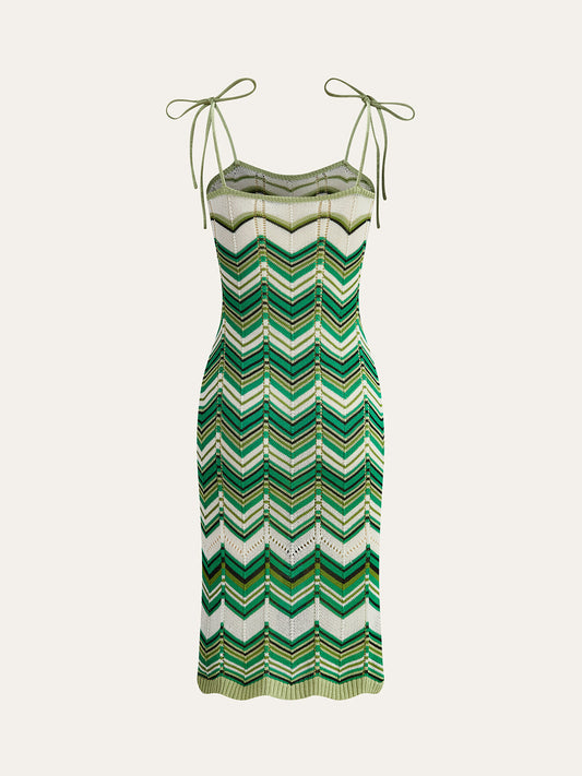 Chevron Desenli Kravat Askılı Örgü Midi Elbise