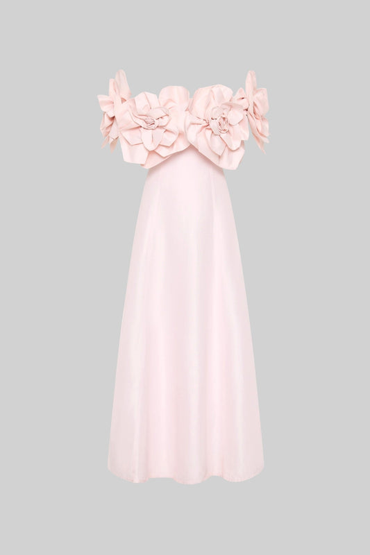 Büyük Kumaş Çiçek Desenli Omuzları Açık Midi Elbise