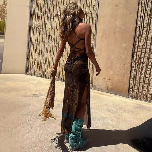 Baskılı Sırtı Açık Askılı Midi Elbise