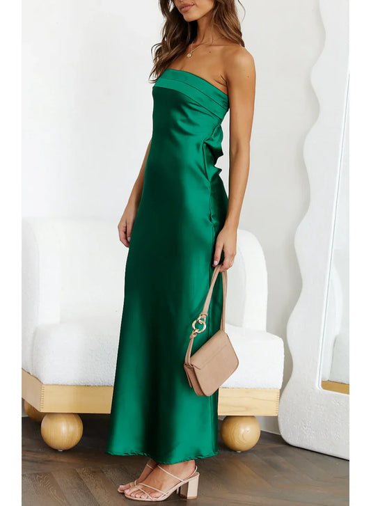 Saten Katlamalı Göğüs Üstü Maksi Elbise