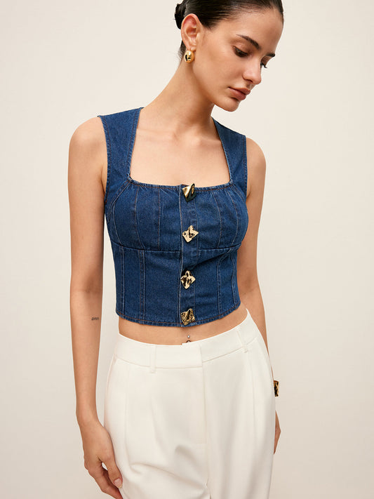 Pamuklu Kare Yaka Düğme Detaylı Kot Üst