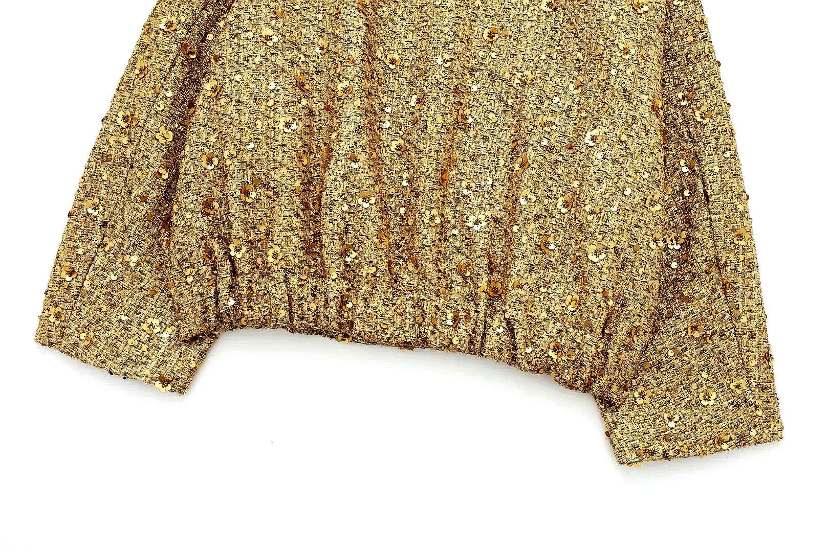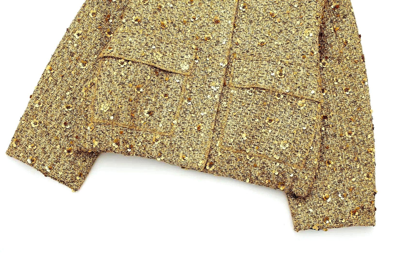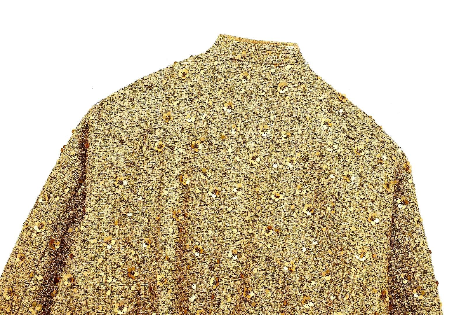 Özel günler için veya cesur bir açıklama yapmak istediğinizde mükemmel olan bu lüks payet süslemeli tüvit ceketle altın gibi parlayın. Özel dikim kalıbı ve şık, modern tasarımıyla bu ceket, sofistike görünümü göz alıcı bir dokunuşla birleştiriyor. Unutulmaz bir görünüm için zarif bir pantolon veya şık bir etekle eşleştirin!