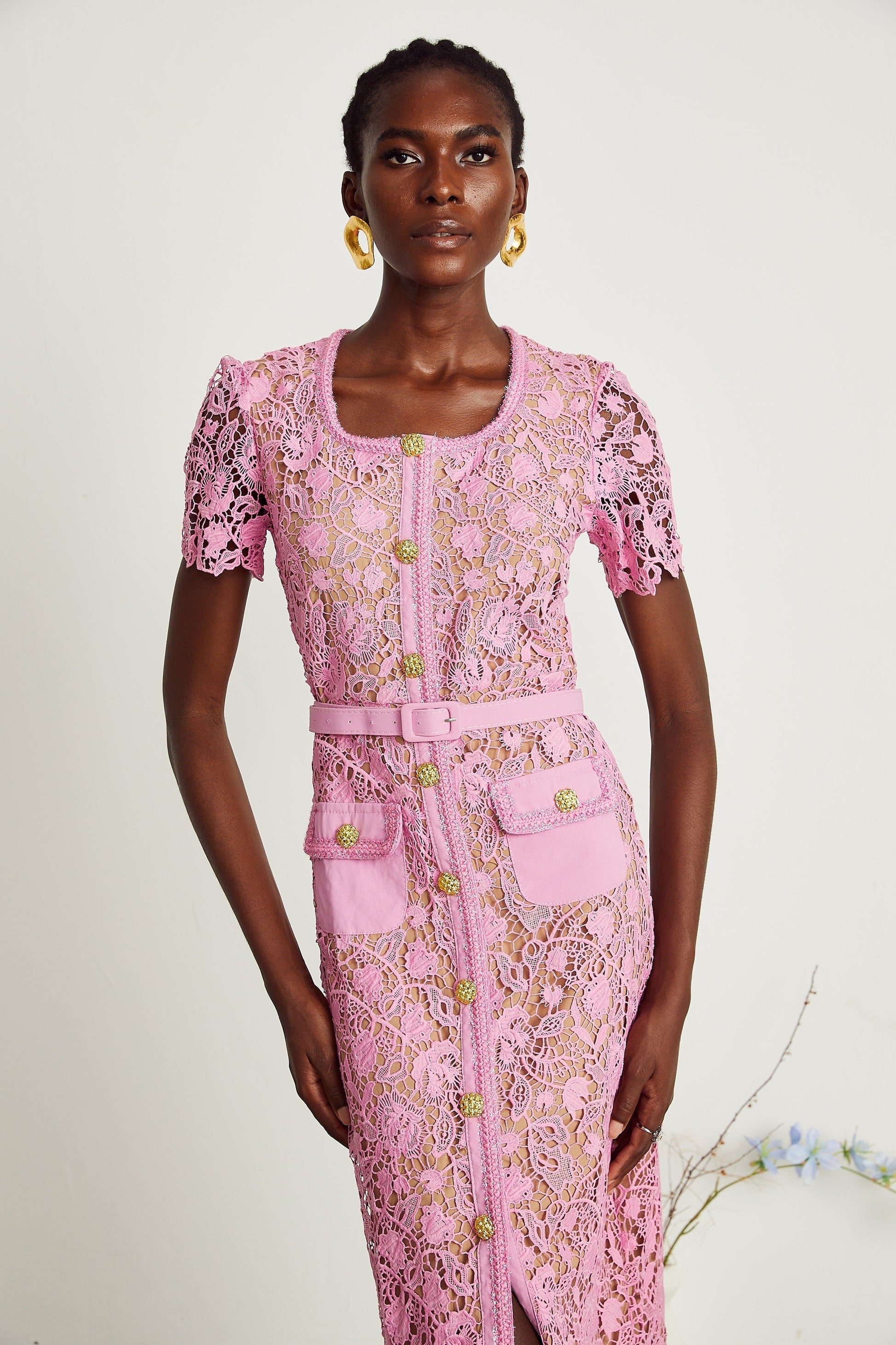 Anastasie Pembe Dantel Kaplama Midi Elbise