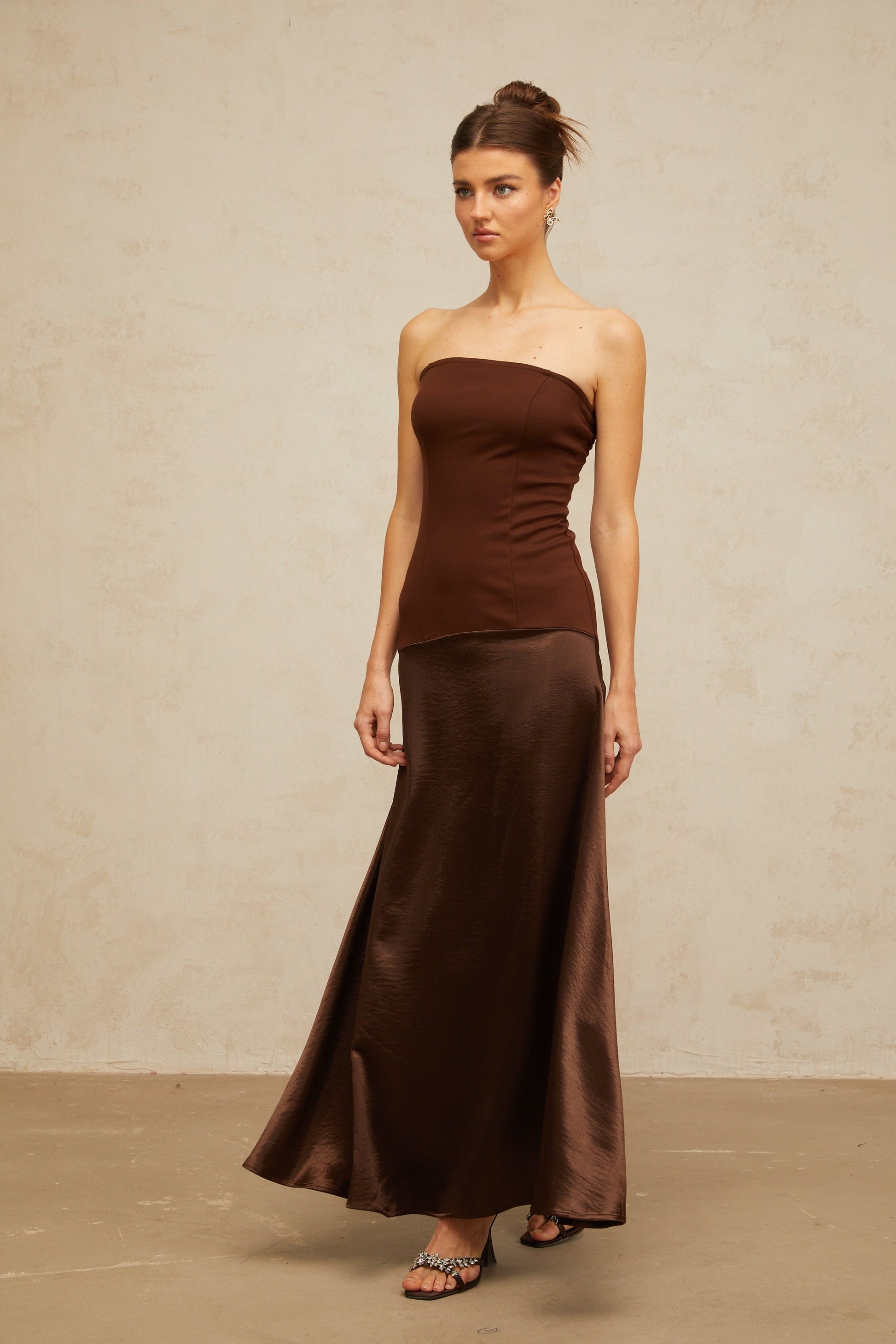 Blaise Kahverengi Straplez Saten Panelli Maksi Elbise