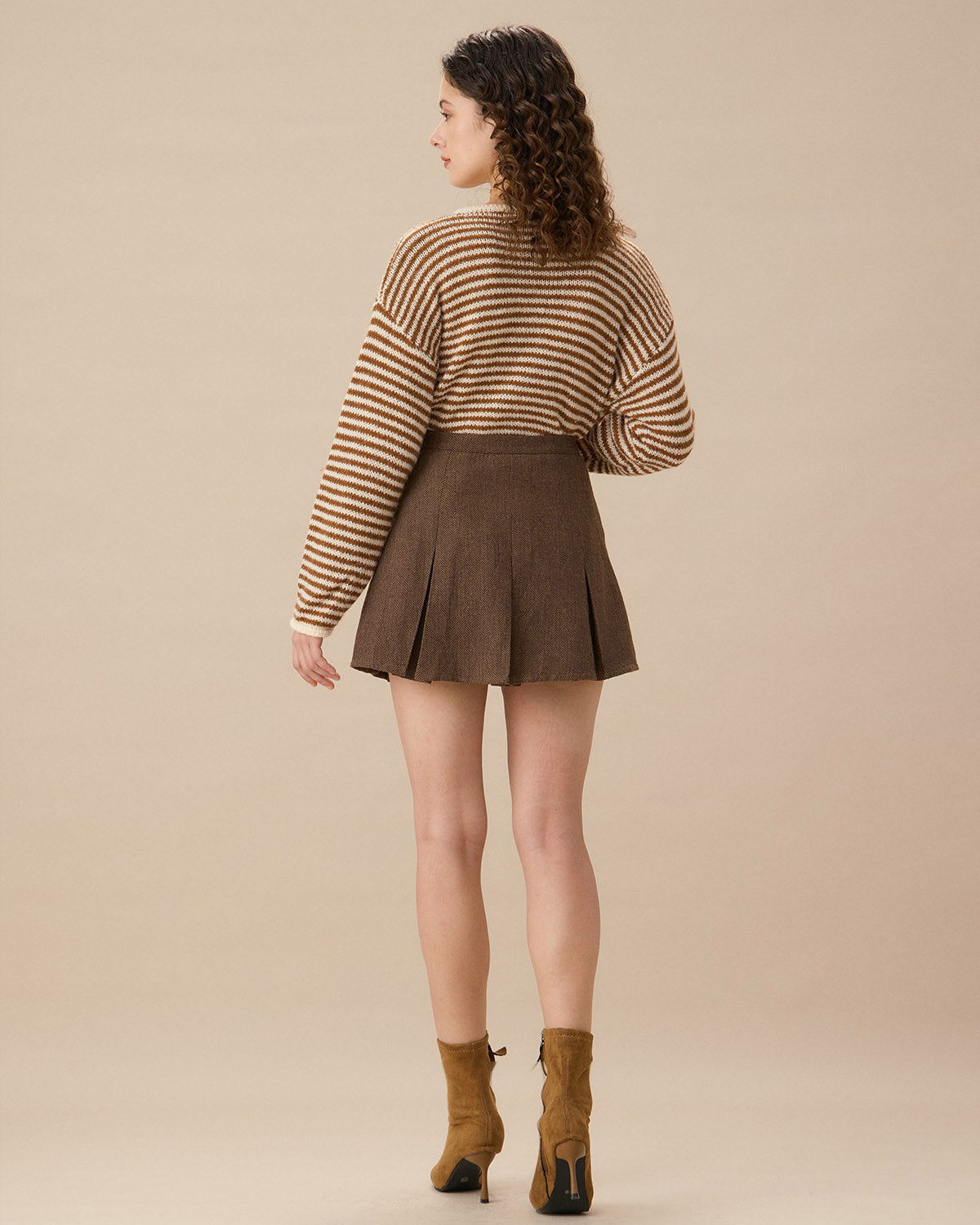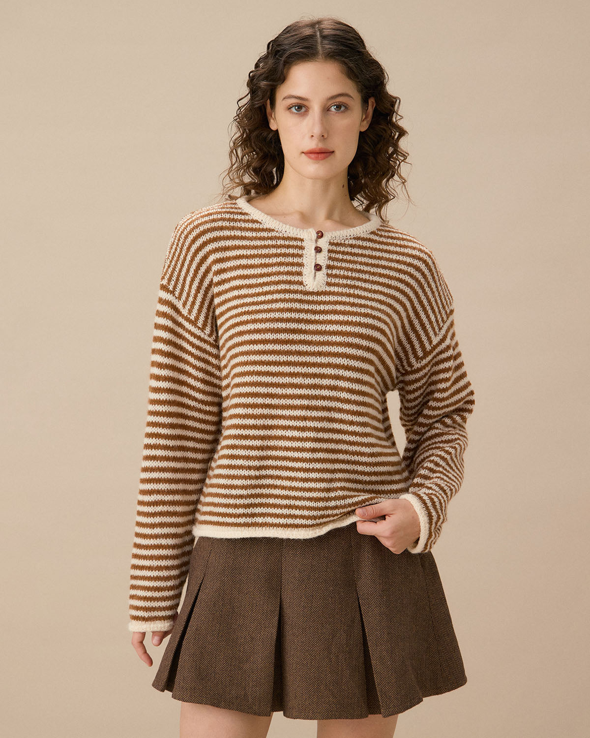 Kahverengi Çizgili Düşük Omuzlu Kazak