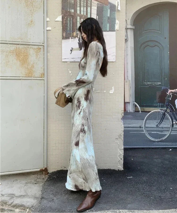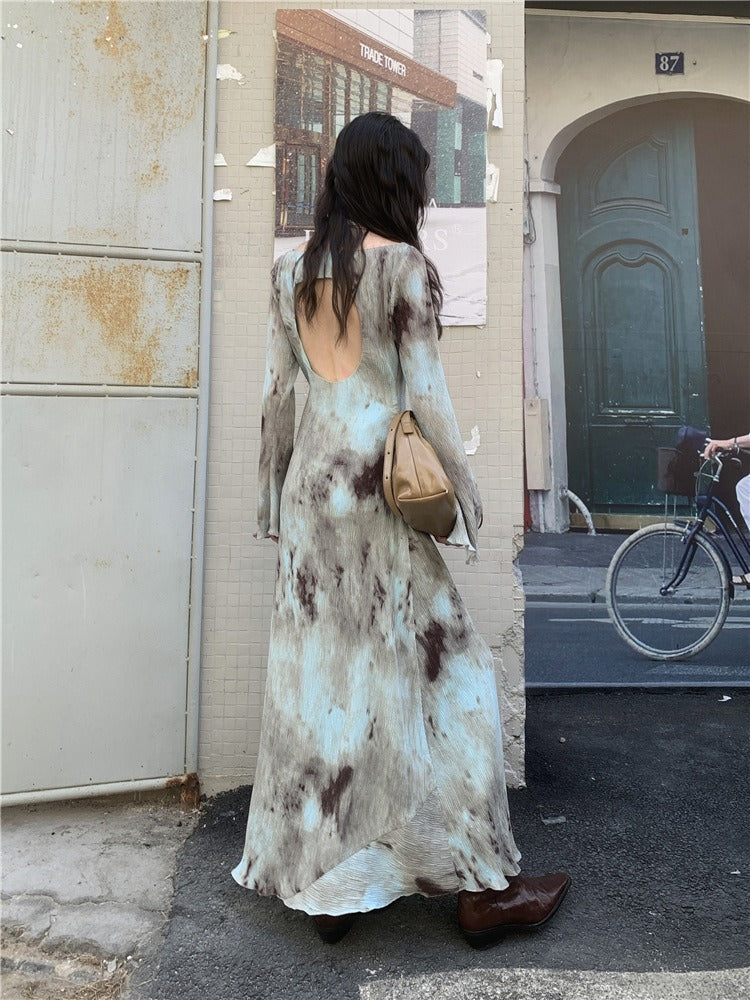 Cherr Mermer Desen Sırt Dekolte Uzun Kollu Maxi Elbise