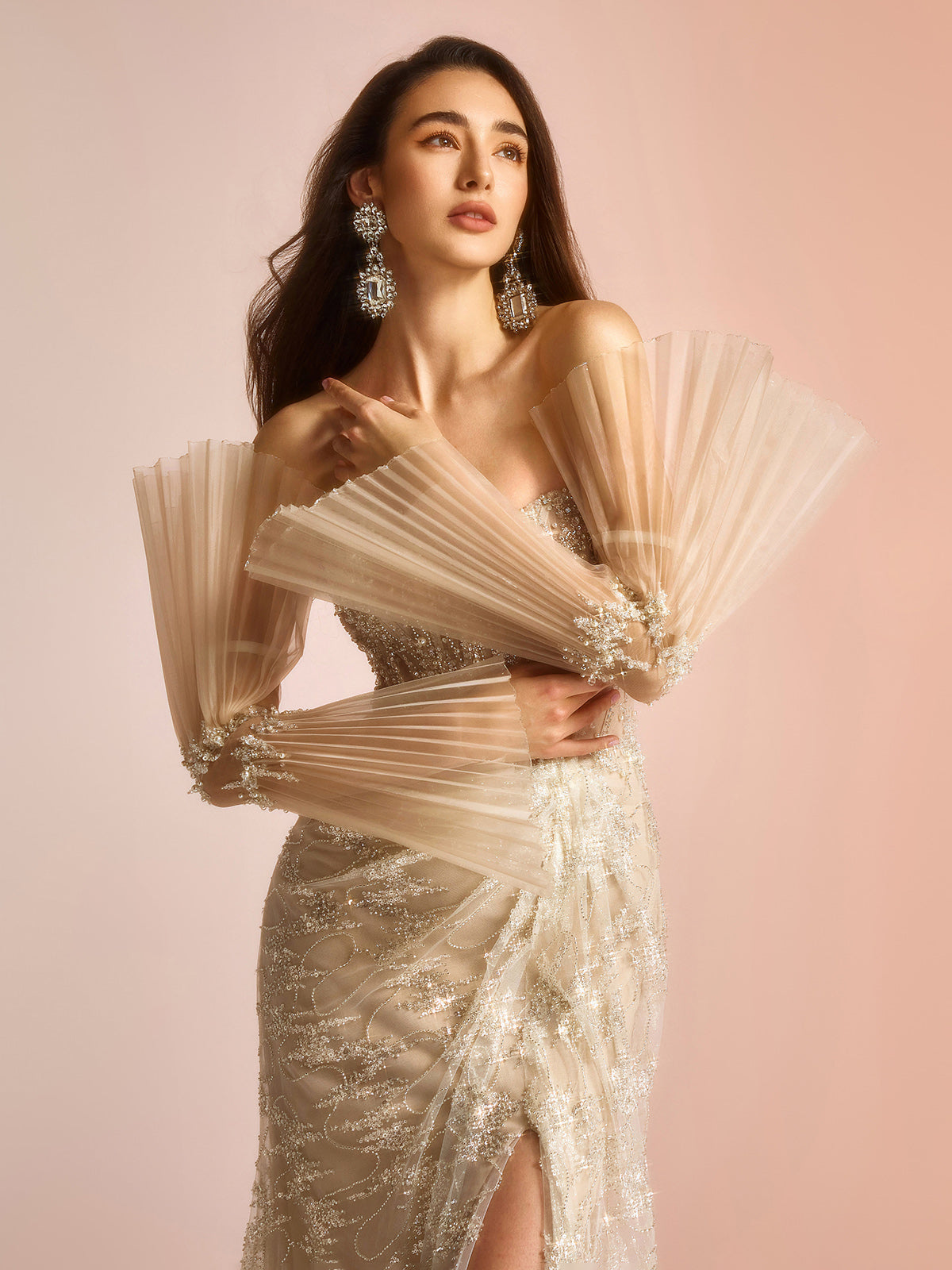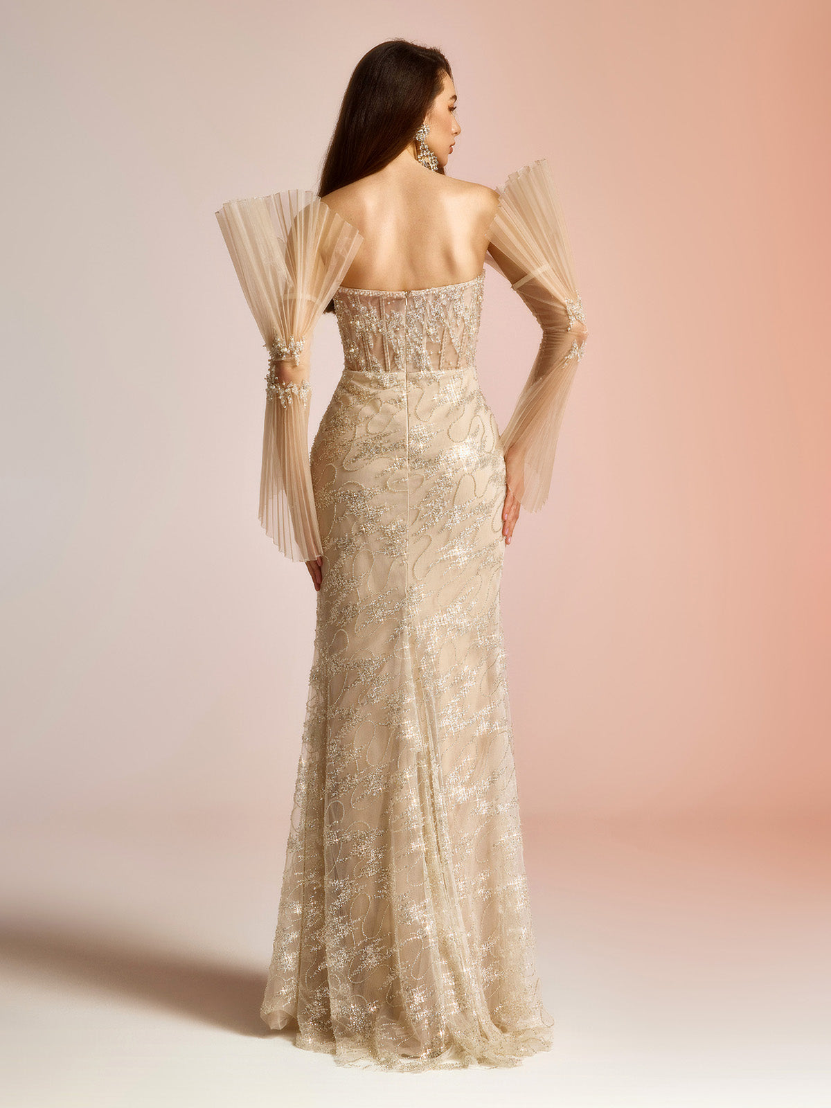Glam Zarif Panelli Tül Uzun Kollu A Kesim Maxi Elbise