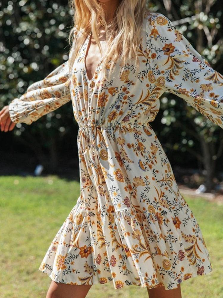 Delia Baskılı V Yaka Köylü Mini Elbise