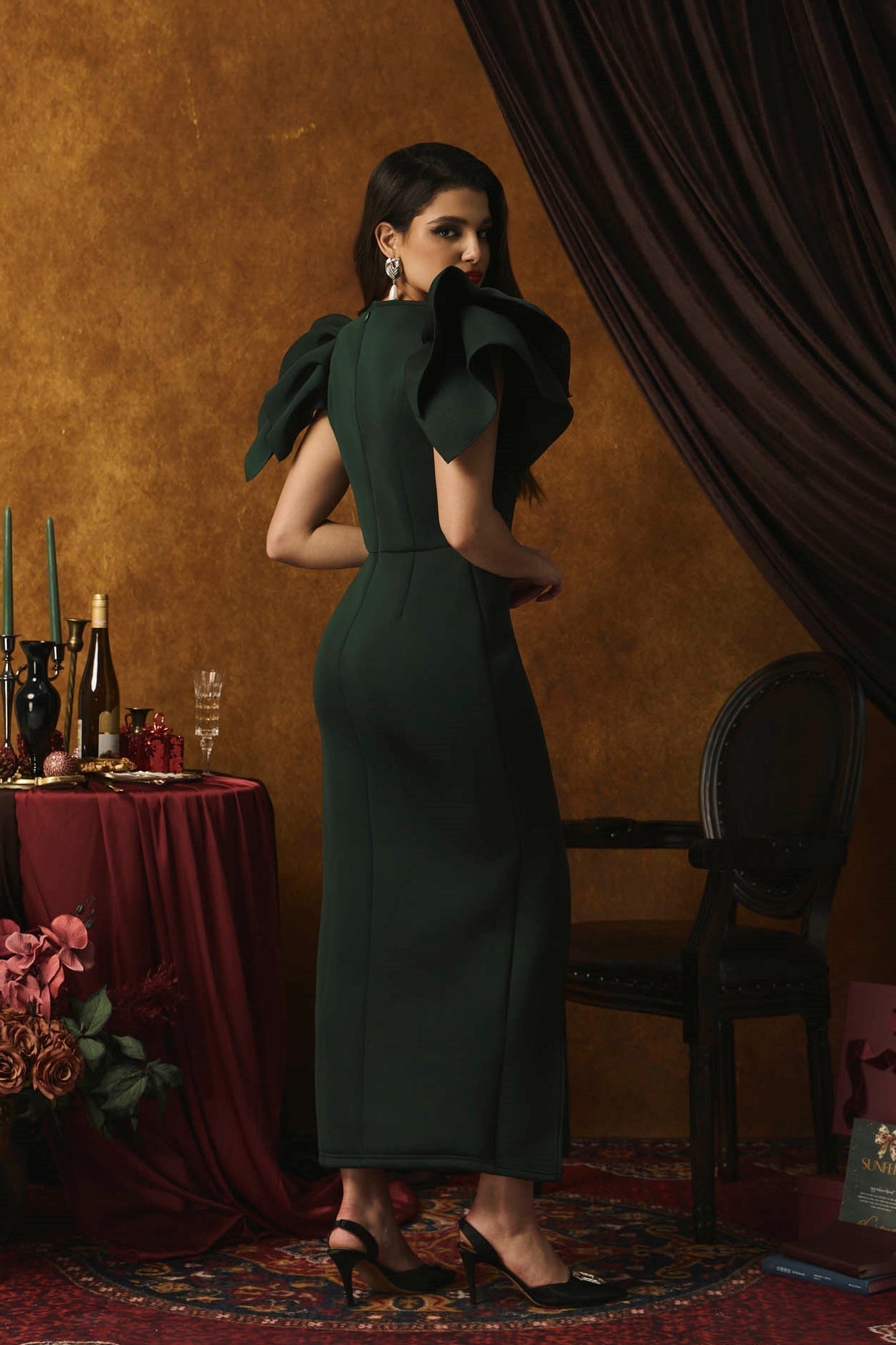 Ethel Kol Volanlı Uzun Yırtmaçlı Elbise
