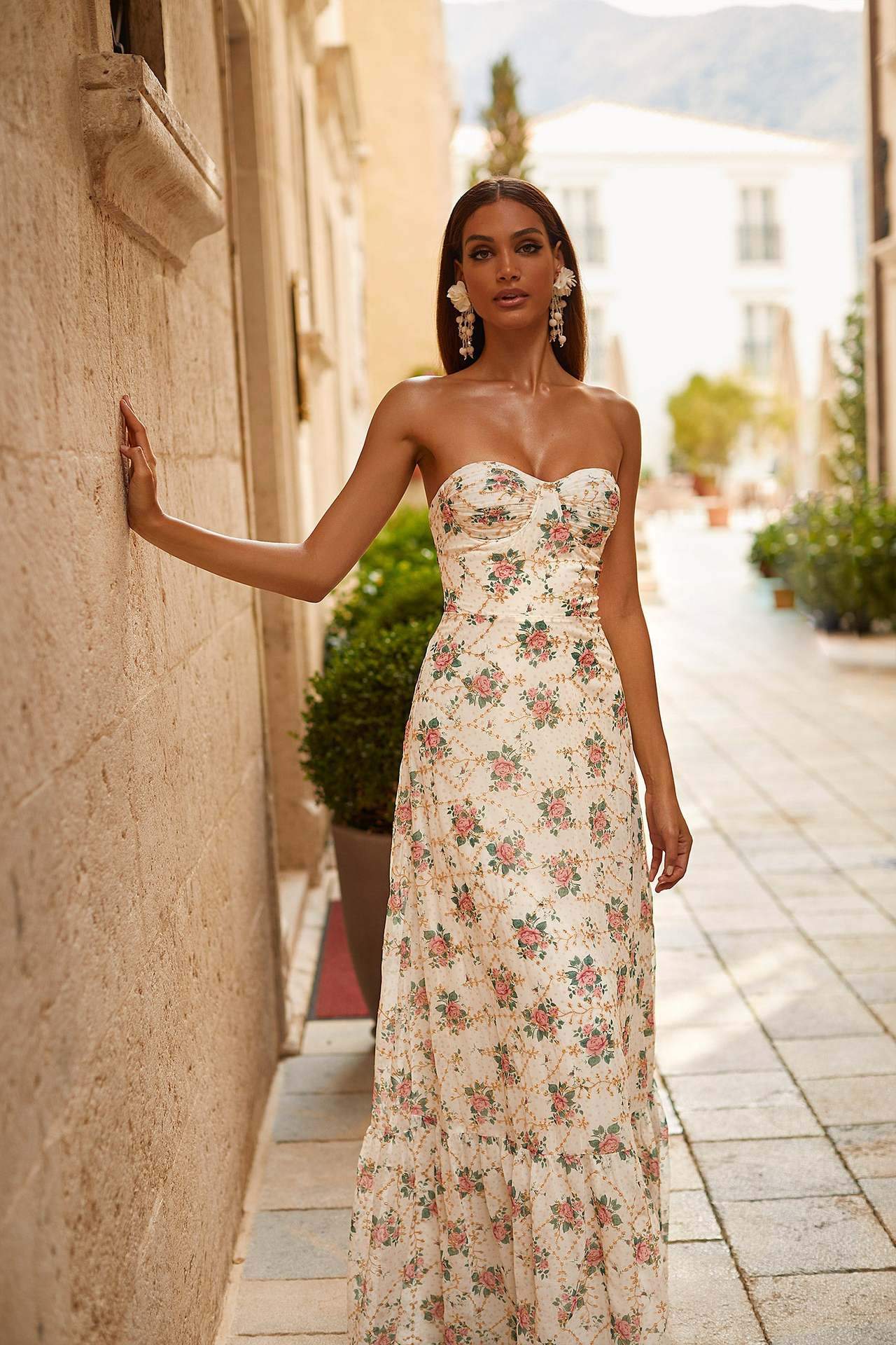 Georgia Baskılı Bağcıklı Straplez Uzun Elbise