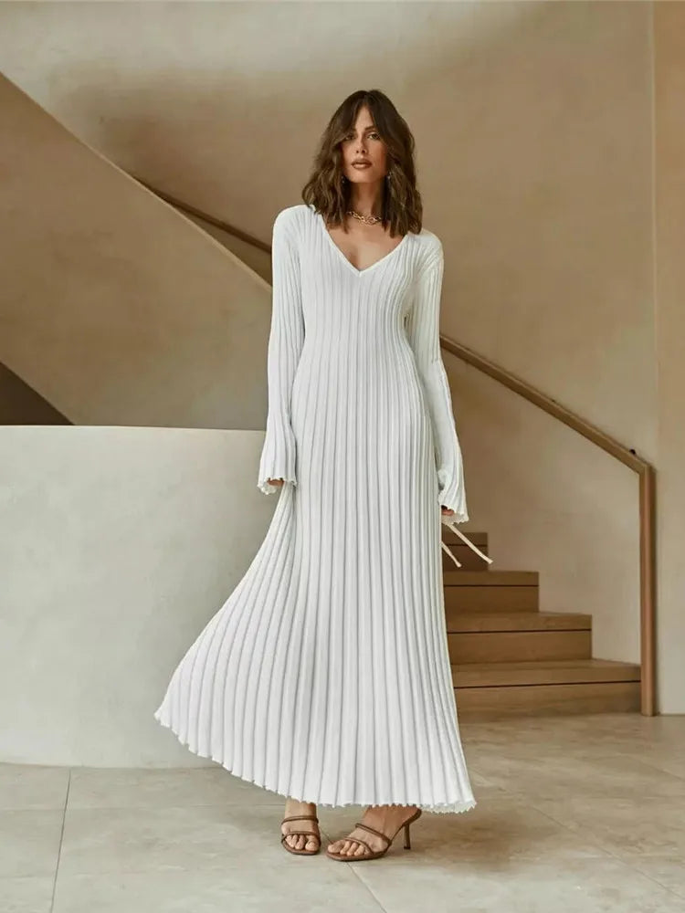 Geniş Fitilli V yaka Maxi Elbise