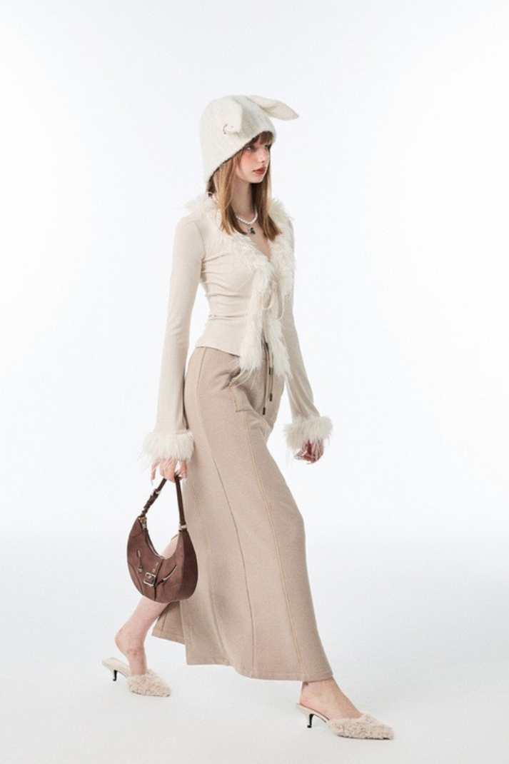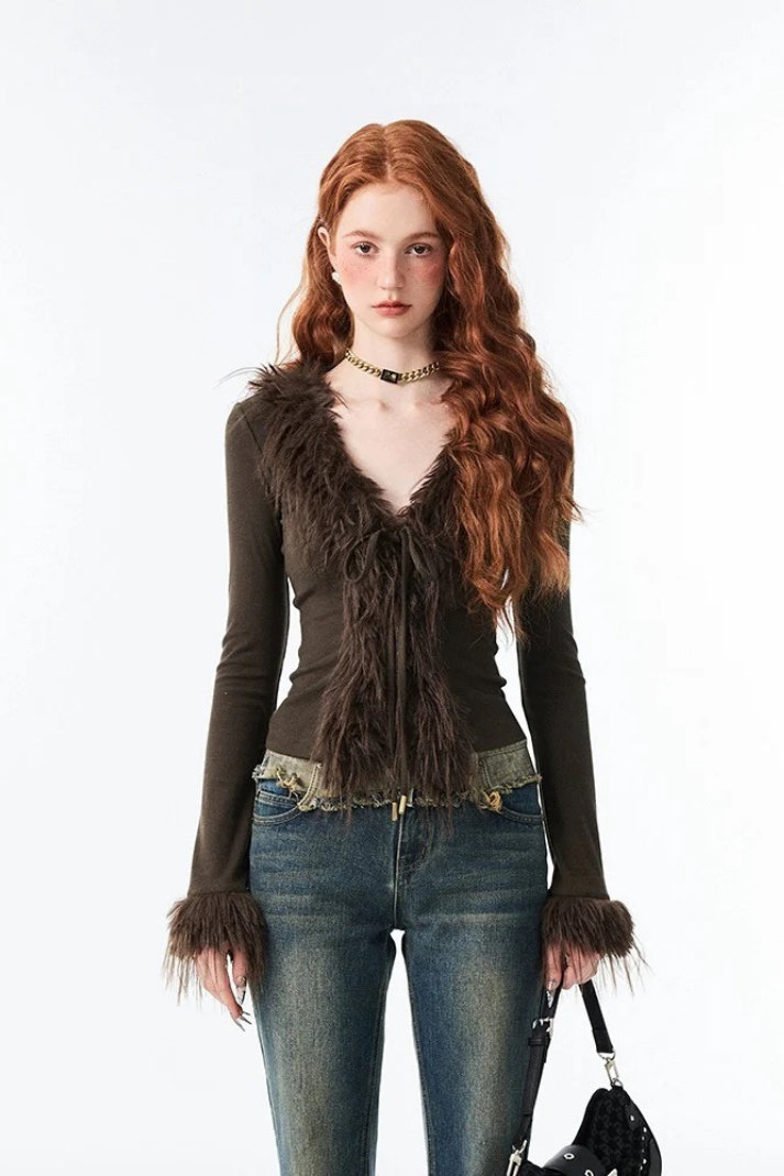 -Detaylar: Uzun kollu, V yaka, normal kalıp, yaka ve manşetlerde peluş detaylar
