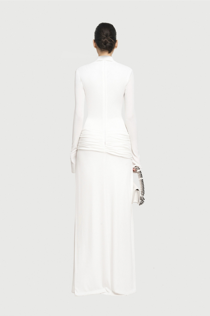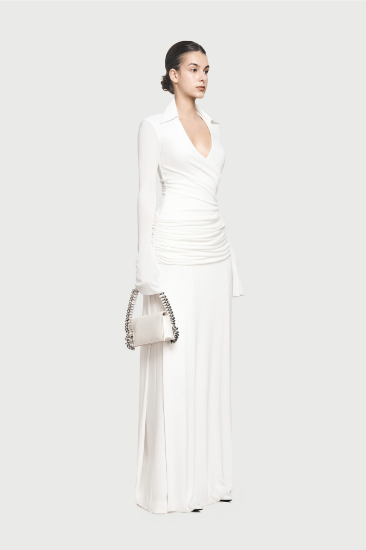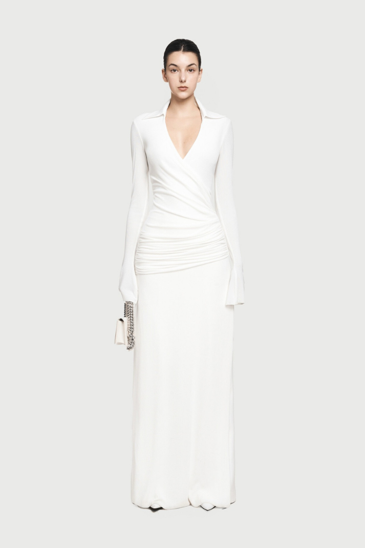 -Stil: Drapeli ve büzgülü uzun elbise